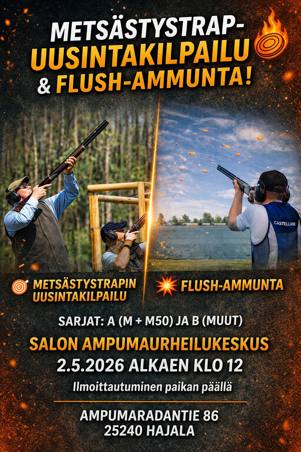 Sarjat: -A (M + M50) -B (Muut) -20€/kierros ja 50€/3 kierrosta -FLUSH 25€/ampuja/kerta Salon ampumaurheilukeskus 2.5.2026 alkaen klo 12:00 Ilmoittautuminen paikan päällä Kahvila auki ------------------------------------------ Ampumaradantie 86 25240 Hajala