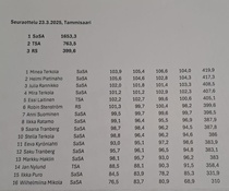 Sunnuntaina 23.3.2025 ammuttiin perinteikäs kolmen seuran (SaSA, TSA, RS) välinen seuraottelu. Tällä kertaa kävi niin, että vain SaSA sai joukkueeseen vaadittavan määrän ampujia linjalle, tai oikeastaan SaSAlaisilla olisi voinut olla kolme neljän hengen joukkuetta ja olisi ollut vielä yksi varamieskin. Tuloksellisesti seuraottelu oli kaikkien aikojen kovatasoisin ilmakivääriseuraottelu. Henkilökohtaisen kilpailun voitti SaSAn Minea Terkola, joka ampui desimaaliaikakauden selvästi kovimman tuloksen 419,9 pistettä. Toiseksi tuli SaSAn Helmi Pietinalho tuloksella 417,3, joka oli kaikkien aikojen toiseksi kovin tulos. Kolmanneksi tuli SaSAn Julia Rannikko tuloksella 408,5 ja neljänneksi tuli Mira Terkola tuloksella 407,6. Neljän ensimmäisen SaSAlaisen yhteenlaskettu joukkuetulos oli 1653,3 pistettä, se on 413,3 pisteen keskiarvolla todella kova ja alleviivaa SaSAn todella vahvaa kivääriosaamista. Turun Seudun Ampujilla oli mukana kaksi kilpailijaa ja RS sai kotiradalleen vain yhden osallistujan. SaSAlaisia oli paikalla peräti kolmetoista ampujaa, joista kolme saa vielä ampua tukisarjoissa, eli uutta sukupolvea ajetaan jo sisälle pitämään SaSAn kivääriampujat voitokkaina tulevinakin vuosina. Vaikka ei meillä mitään hätää tule olemaan, voittajajoukkueen keski-ikä on karvan päälle 20 vuotta.