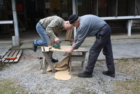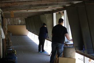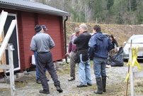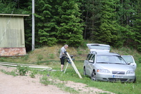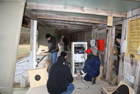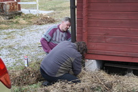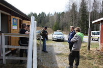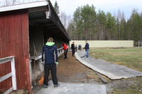 ![]() Heikki jututtaa nuoria talkoolaisia. | ![]() Taulujen putsausta ja kuulutuslaitteen testausta. |